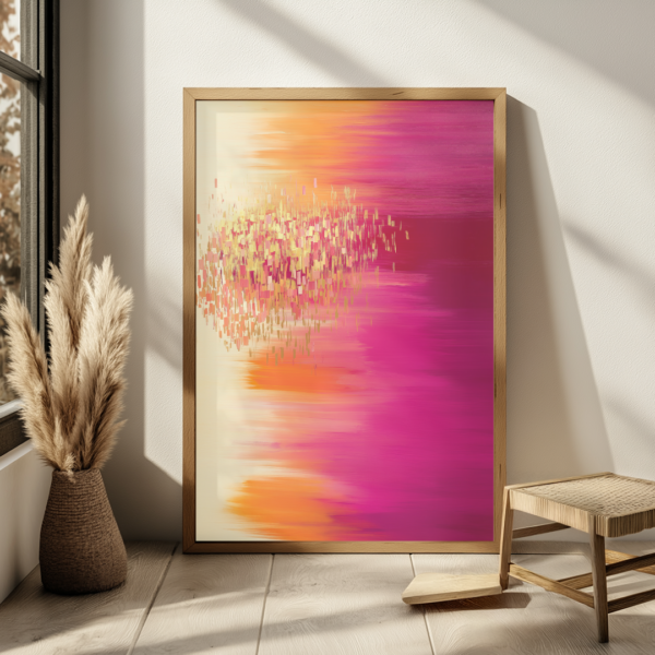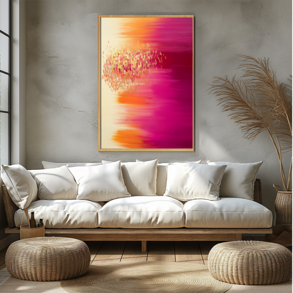 Luminous Red is a striking composition of warm, radiant hues. Shades of deep crimson, magenta, and golden amber flow seamlessly, evoking the energy of a sunset melting into the night. The scattered light-like pixels give a sense of motion, as if the colors are dispersing into space.