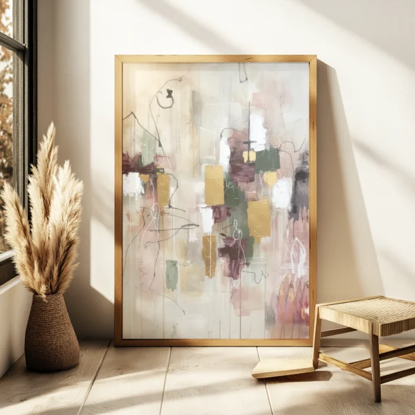 Ossira captures a quiet tension between control and spontaneity. Earthy greens, muted pinks, and deep maroon tones flow through layered blocks, freeform lines, and soft golden accents. The abstract balance of texture and motion gives the piece a grounded yet expressive energy — calm but full of movement.